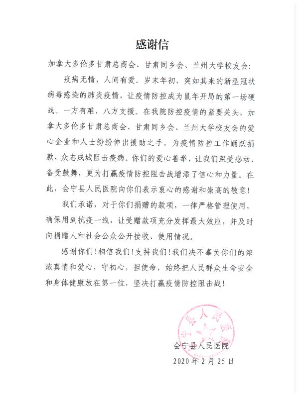 旅居大多伦多地区的甘肃老乡援助家乡抗击新冠疫情